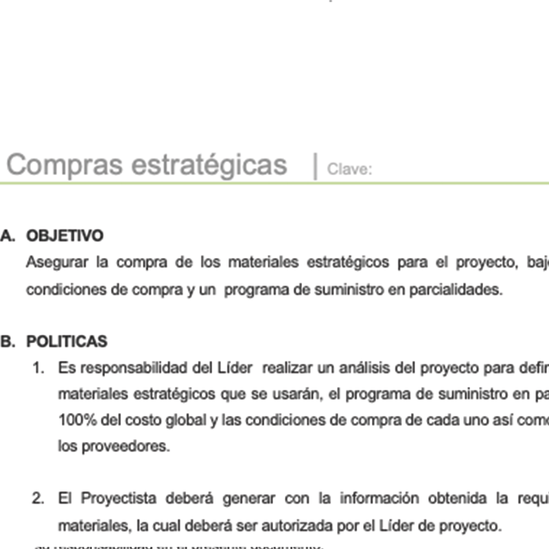 Esta política te permitirá establecer los lineamientos para definir de acuerdo al proyecto cuales son los insumos estratégicos, así como realizar en tiempo y forma su adquisición para poder tenerlos disponibles en el momento en que se necesiten.