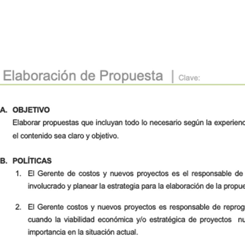 Esta política te permitirá establecer los lineamientos para realizar la propuesta de servicios, considerando las especificaciones técnicas, los costos y presupuestos y términos específicos en cuanto a la forma de pago.