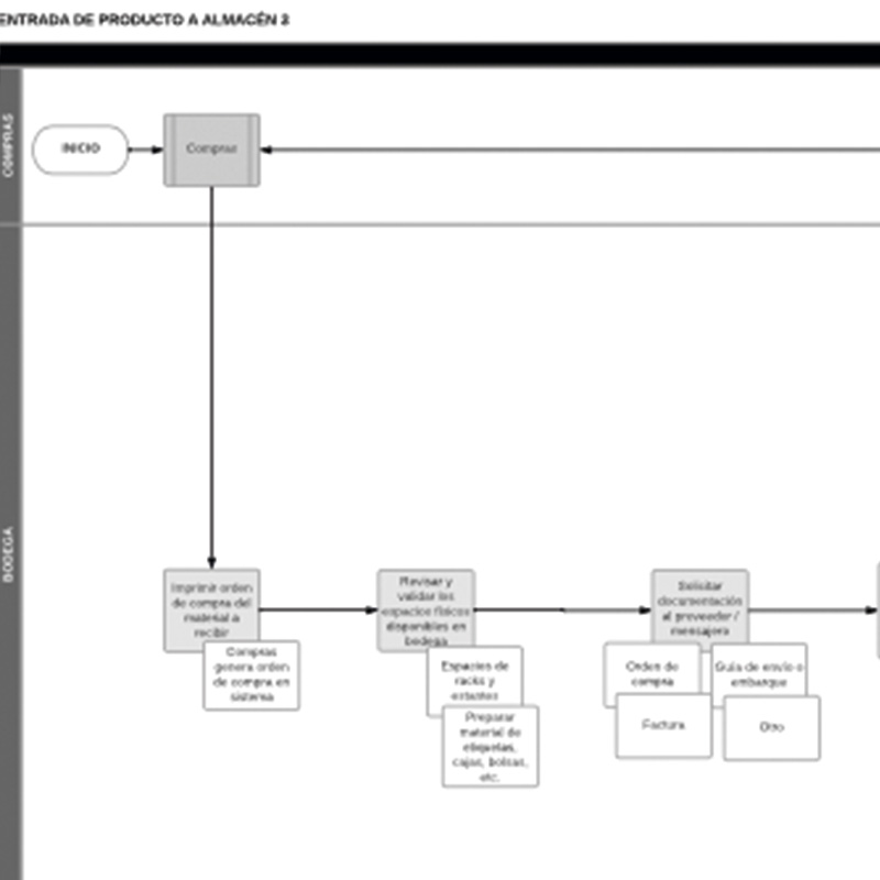 Este diagrama te ayudará a definir las actividades para asegurar la correcta entrada del producto en el almacén, considerando la revisión de los espacios físicos disponibles dentro del almacén, el control en la recepción de los pedidos y el etiquetado.