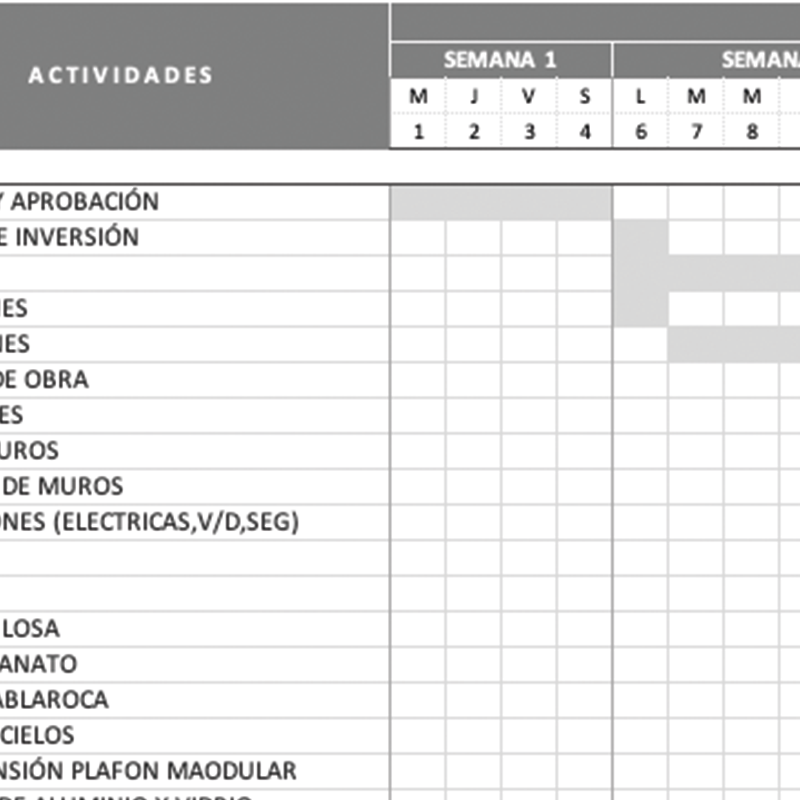 Este formato te permitirá establecer tiempos y planificar las etapas y duración de cada una de las actividades de tu proyecto de construcción.