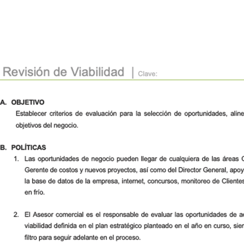 Esta política te permitirá establecer los lineamientos para evaluar las oportunidades de negocio considerando los objetivos del negocio en cuanto a viabilidad estratégica y técnica.