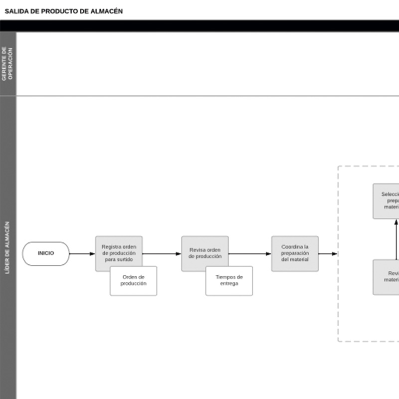 Este diagrama te permitirá definir las actividades necesarias  para dar salida al producto del almacén y entregarlo en producción, considerando, entre otros aspectos, la recepción de las órdenes de producción,  la preparación del material y la actualización del inventario en el sistema.
