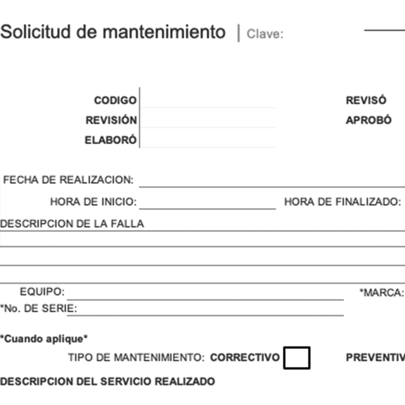 Este formato te permitirá contar con una solicitud de mantenimiento por parte de las áreas de producción, al identificar una necesidad de mantenimiento, revisión o reparación de un equipo.