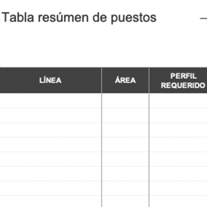 Este formato te permitirá contar con un listado de los puestos de la organización, definiendo responsabilidades, habilidades, sueldo y jefe inmediato, entre otras características, como apoyo al área de recursos humanos.