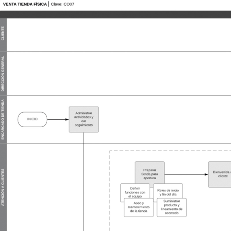 Este diagrama te ayuda a definir las actividades necesarias para realizar ventas a cliente de forma directa, considerando las actividades de limpieza y apertura de la sucursal, el protocolo de atención al cliente, la forma de cobro, así como la entrega de producto.